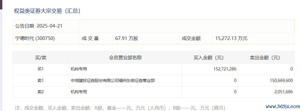 宁德时代今日大宗交易成交67.91万股,成交额1.53亿元宁德时代今日大宗交易成交67.91万股,成交额1.53亿元